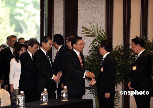 4月26日,陈云林率海协会成员恭候江丙坤等海基会成员入场。当日,海协会和海基会第三次会谈在南京紫金山庄举行。中新社发 廖攀 摄