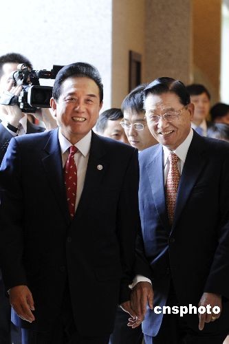 4月26日11时许,会谈结束后陈云林和江丙坤手拉手步出会场。当日,海协会和海基会第三次会谈在南京紫金山庄举行。中新社发 廖攀 摄
