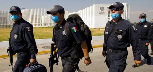 联邦警官戴上口罩,以防感染的猪流感病毒。
