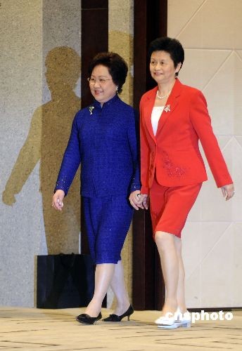 4月26日下午,陈云林夫人赖晓华与江丙坤夫人陈美惠手拉手进入签字仪式现场。当日,海协会和海基会在南京紫金山庄签署《海峡两岸空运补充协议》、《海峡两岸金融合作协议》、《海峡两岸共同打击犯罪及司法互助协议》三项协议。中新社发 廖攀 摄