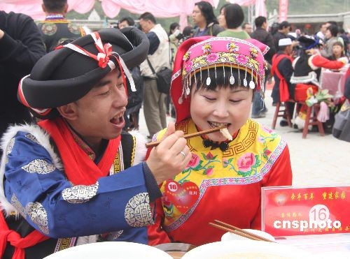 4月26日,四川省北川县政府在擂鼓镇吉娜羌寨为20对“5·12”大地震后重组家庭夫妇举行集体婚礼。北川官方为他们举行坝坝喜宴,每对新人约请8名亲朋好友参加。婚庆活动结束后,新人们将前往海南,享受政府提供价值10万元的厚礼——三亚五日蜜月旅行。这是北川自2003年成立羌族自治县以来举行的首场集体婚礼。由政府出资,专为北川籍震后重组家庭操办的。此次活动有利于灾民看到人生的希望,走出地震阴影,开始新的生活,“建起精神家园”的意义。中新社发 郭国权 摄