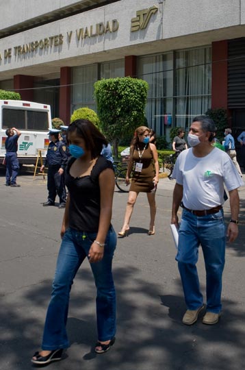 地震发生后,墨西哥城的一些群众戴着口罩来到建筑物外。