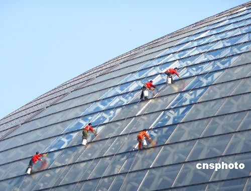 4月27日,保洁人员正在认真清洗北京国家大剧院外壁上的尘土,使其以靓丽清洁的容貌迎接“五一”国际劳动节的到来。中新社发 玉龙 摄