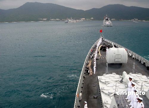 4月28日,中国海军远赴印度洋亚丁湾、索马里海域圆满完成护航任务的首批舰艇编队凯旋,顺利返回海南三亚。图为编队“武汉”号(前)、“海口”号导弹驱逐舰缓缓驶向三亚军港码头。中新社发 孙自法 摄