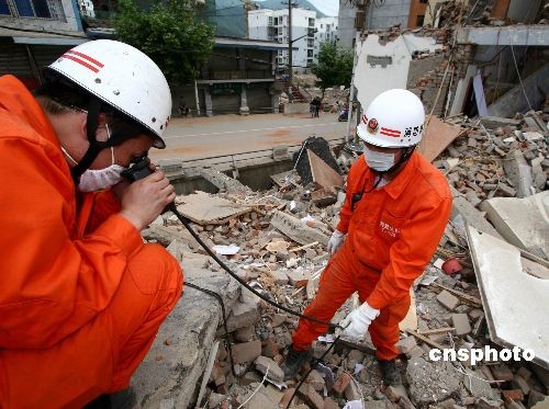 资料图片:2008年5月15日,福州消防支队赴川抗震救灾官兵在青川县宾和路一家主建筑已全部坍塌的大型汽车维修厂,用生命探测仪成功解救出一名被困女工。当时,在接群众求助后,救援队立即赶赴现场,搜索分队首先用生命探测仪确定了女工被困的大概方位,救援分队迅速启动救生气垫,并用铁锹和双手以土工的方式为被困女工打开了一条生命通道,半个小时后,被困女工被成功救出。中新社发 朱晓航 摄