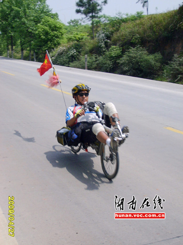 “他头上带着头盔和太阳镜,腿上套着护膝,是一名户外爱好者。造型非常拉风。而最特别的当属他的车,是非常罕见的卧式自行车!”
