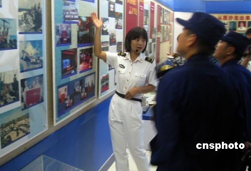 永兴岛上女士官向护航官兵讲解该岛历史沿革。中新社发 孙自法 摄