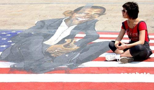2009年4月30日,一位游客在南京玄武湖公园与“奥巴马”“对话”。当日,参加南京玄武湖公园首届三维空间立体绘画展的20幅画作全部完成,将在“五一”小长假期间为游客助兴。