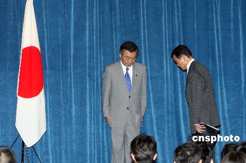 日本首相麻生太郎(右)在北京举行记者招待会前,向日本国旗鞠躬。中新社发 张宇 摄