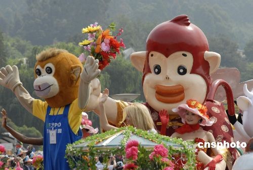 图为载着99昆明世博会吉祥物“灵灵”的花车在市区巡游。中新社发 杨洋 摄