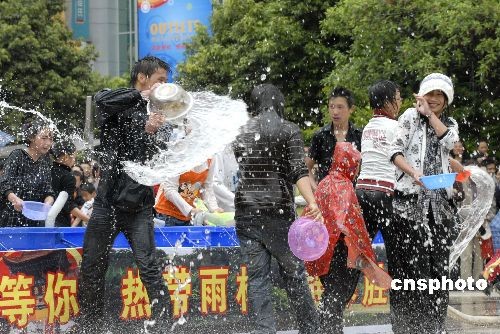 5月2日下午,上千人聚在昆明西寺塔广场,相互泼水狂欢。昆明国际文化旅游节期间,主办方为海内外游客准备了丰富多彩的节目,包括泼水节、长街宴、展现民族风情的花车巡游等,其中泼水节成为人气最高的节目之一,特别是受到了儿童的欢迎。