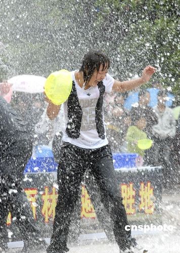 图为一名外地游客感受泼水的快乐。中新社发 保旭 摄