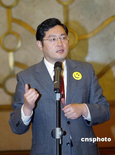 外交部发言人秦刚同大学生共赴钓鱼台国宾馆参观,进行面对面交流。中新社发 郑雄增 摄