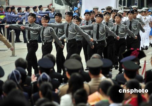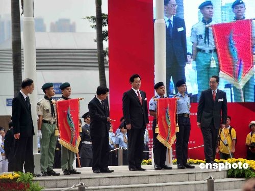 五月四日,香港湾仔金紫荆广场举行五四运动九十周年升旗仪式,中联办副主任李刚、香港政务司司长唐英年等出席。中新社发 谭达明 摄