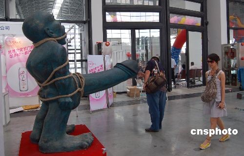 5月4日,广西南宁国际会展中心举行的一个性健康文化节上,著名现代艺术作品《锁不住》人体雕塑吸引了众多参观者的目光,这件雕塑高2.3米,宽1.35米,生殖器长1.7米,重约120公斤。主办者称,这是中国目前最大的以性文化为主题的雕塑作品,该作品造型醒目,寓意深刻,暗指“性,是捆绑不住的”。中新社发 肖柳 摄