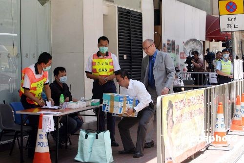 五月五日,香港确诊感染H1N1甲型流感的墨西哥男子入住的湾仔维景酒店隔离进入第五日,三百多名住客和酒店员工仍在内接受隔离。当天有法国领事馆人员向该酒店住客送赠日用品。中新社发 洪少葵 摄