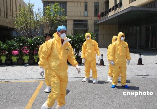 5月5日,墨西哥政府安排的包机将接回4月30日AM098航班墨西哥籍乘客和机组人员。图为参加墨西哥籍乘客和机组人员转运行李的上海工作人员,在上海南汇区的集中医学观察点,接受消毒。中新社发 潘索菲 摄