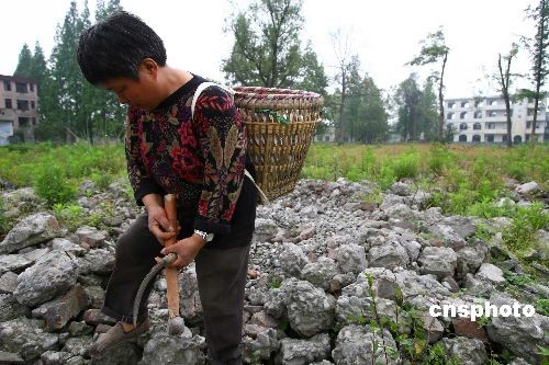 五月初的四川大地震一周年前夕,一位拾荒者在都江堰聚源中学原址废墟上捡拾废品,该中学在去年5.12大地震中受灾严重。中新社发 富田 摄