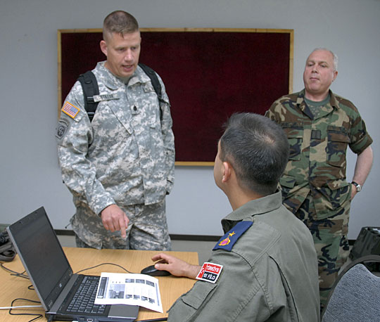 美国军官(左)与土耳其军人(右)在军演活动中交谈。