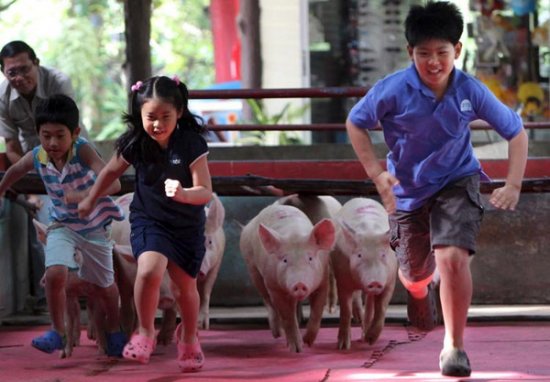 图:泰国曼谷举办人猪赛跑(2)