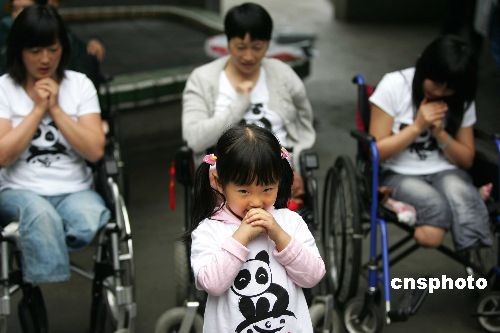 5月7日,四川大地震将迎来一周年之时,共计几十家境内外媒体的记者走进位于四川省人民医院内的地震伤员康复中心。该中心去年六月二十三日成立后到今年四月三十日新收治地震伤员二百三十四人。图为小朋友王诗琪(前)及母亲杨兰(后左)还有几位肢残患者一起用手语演唱“感恩的心”。这对母女是汶川人,在大地震中女孩的父亲不幸遇难,母亲失去的双腿,在康复中心杨兰得到了全面的治疗。 中新社发 富田 摄