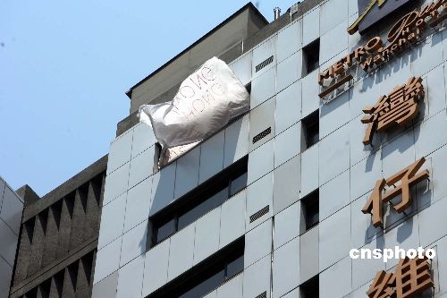 五月八日上午,在香港湾仔维景酒店被隔离的住客挂“我们爱香港”的横额。有关当局将在当晚八时半解封因甲型流感而隔离七天的酒店。中新社发 洪少葵 摄
