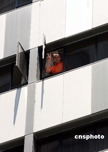 五月八日上午,香港湾仔维景酒店气氛较为轻松,有住客在大堂隔着玻璃与途人挥手。酒店将在八日晚解封。中新社发 洪少葵 摄
