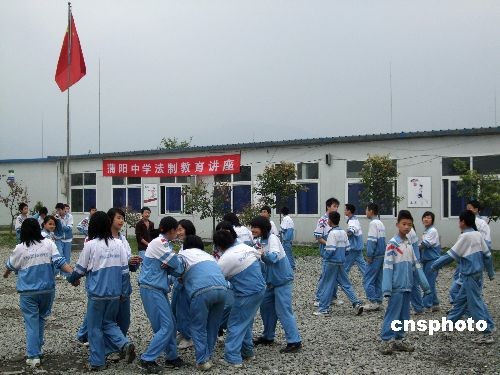5月8日,在距离都江堰市中心不远的一所板房学校内,来自蒲阳中学的一群中学生正在欢乐嬉戏。大约一年前,他们在顷刻之间失去了学校和家园,临时盖起的简易住房成了他们弥足珍惜的“乐园”,随着都江堰各大学校援建工程的加紧建设,这些孩子们下学期就有望搬入新学校,恢复震前正常的学习生活。中新社发 郑莹莹 摄