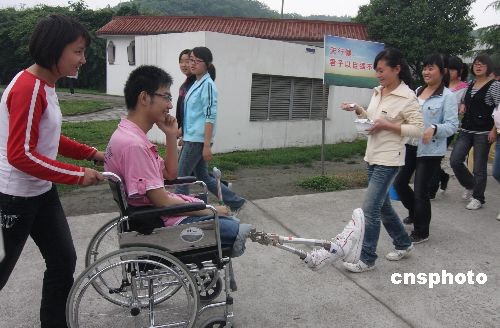 5月8日,“夹缝男孩”郑海洋在四川省北川中学康复站进行康复训练。“夹缝男孩”——北川中学高一学生郑海洋在地震农历一周年5月2日重返校园,重新走入同学中间,开始新的生活。中新社发 郭国权 摄