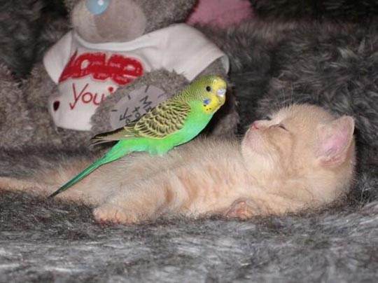 趣图:小鹦鹉戏耍酣睡猫 引其入鸟笼(4)