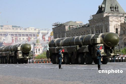 5月9日,俄罗斯在首都莫斯科举行盛大阅兵式,庆祝卫国战争胜利64周年。图为阅兵式上展示的“白杨”-M移动式洲际战略导弹系统。中新社发 田冰 摄