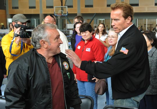 当地时间5月9日,美国加利福尼亚州州长施瓦辛格在圣巴巴拉一个临时庇护所里看望山火受灾民众。加州山火已造成百余所房屋被毁,3万余人被迫撤离。