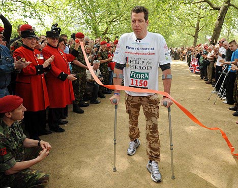 英国一名在伊拉克受伤、医生曾指他无法再走路的军人,花了两周时间,于当地时间9日完成伦敦马拉松赛事。这位名叫Phil Packer现年36岁的少校利用拐仗,参加了在4月46日举行的伦敦马拉松,每天走3.2公里路,终于完成全长42.2公里的赛程。