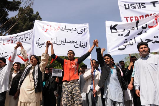 5月10日,在阿富汗首都喀布尔,喀布尔大学学生举行示威游行,抗议大量平民在4日的空袭中伤亡。