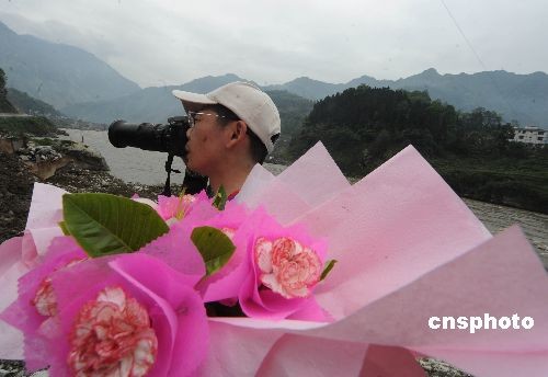 “5.12”四川大地震一周年前夕,一位自愿者手捧鲜花重返震中灾区映秀镇,记录眼前发生的变化。中新社发 贾国荣 摄