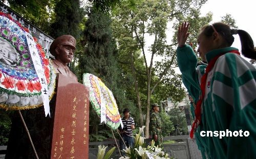 汶川地震一周年前夕,济南军区和四川省都江堰市在都江堰革命烈士陵园举行活动,缅怀和追思“抗震救灾英雄战士”武文斌,共同纪念军民携手夺取抗震救灾的伟大胜利。中新社发 曾宪平 摄