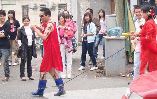 2009年5月10日,湖北恩施街头惊现史上最牛新人,新郎脸上、手、脚上均画上了乌龟等搞怪图案,并穿上连衣裙长筒靴拿着玉米棒子迎娶新娘,而新娘则用一根绳子牵着新郎在其后做赶牛状前行,一路行来,惹得路人纷纷侧目,被称为史上最牛搞怪新人。(何光)