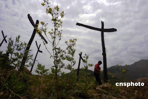 5月11日,四川省广元市青川县东河口地震遗址上鲜花摇曳,一位当地居民在此缅怀逝者。中新社发 廖攀 摄