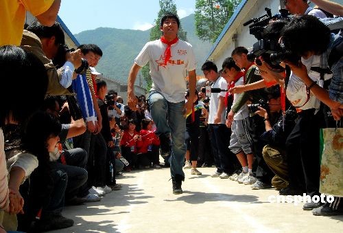 5月11日,“飞人”刘翔前往北川桂溪板房小学,为孩子们上了一堂体育课,在北川桂溪板房小学狭小的巷道里,刘翔教授孩子们如何跨栏,并亲自上阵为小朋友做演示。 刘翔出发前也向媒体这样说:“一直就很想去一次震区,但之前是备战奥运会,之后又是出国疗伤,一直没有机会。这一年来,都是从报纸和电视新闻上了解四川震区的恢复情况,老百姓们都很乐观坚强。其实我也只是个运动员,说不上去慰问,只是想到那里表达我自己对四川人民坚强乐观精神的敬意,也是圆我自己的一个心愿。” 中新社发 胥辉 摄