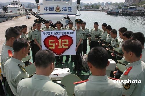 5月11日,海南三亚,在5.12四川汶川大地震一周年之际,海南公安边防总队海警二支队官兵开展“5·12”海上花祭纪念活动。海警官兵们亲手制作了写有“5·12”字样的心形图案画板,在画板上插置了菊花、康乃馨,列队默哀深情缅怀“5·12”大地震遇难同胞。中新社发 黄继辉 摄