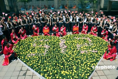在山东省济南市历城职专复课的九十七名四川地震灾区北川师生,“五一二”大地震一周年前在校园广场上举行纪念活动,深切悼念汶川大地震中遇难的同胞。图为师生们在校园广场上用鲜花摆出心形图案,用以寄托对大地震中失去亲人的深切悼念之情。中新社发 李玲贤 摄