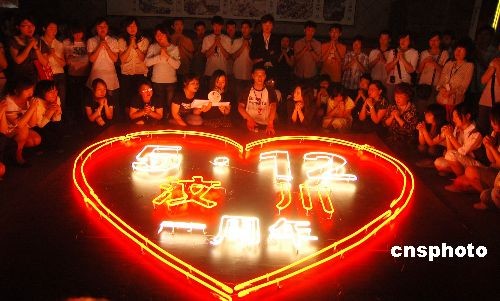 5月11日晚,由苏州残疾热线发起以“光”点亮“爱心”为主题的“汶川地震一周年”纪念活动在苏州观前新艺广场举行。许多高校的学生和爱心志愿者也纷纷响应并积极参与到这场声势浩大的纪念活动中来。他们想通过这种方式缅怀遇难者,并向灾区人们送去美好祝福,希望他们能够克服困难,尽快重建美好家园。中新社发 苏民 摄