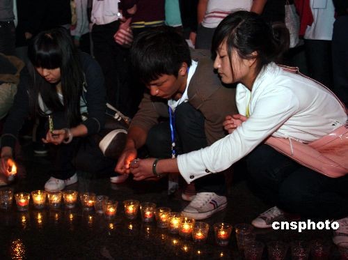 5月11日晚,河南郑州的民众在郑州紫荆山广场点燃蜡烛,纪念汶川大地震一周年。中新社发 王中举 摄