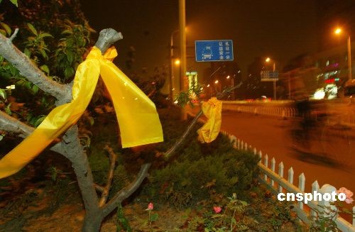5月11日夜晚,天津志愿者将饱含思念与祝福的黄色丝带系满大街小巷,藉此纪念汶川地震一周年,为灾区民众祈福。中新社发 雁柏 摄