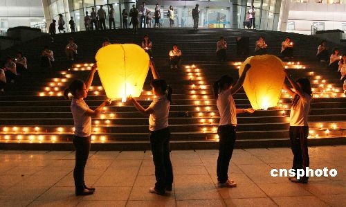 5月11日晚,“5.12”汶川大地震即将一周年,江苏淮阴师范学院来自川、苏、闽的大学生汇集在翔宇广场,点燃爱的烛火,56只代表各民族的孔明灯在祝福声中缓缓放飞。