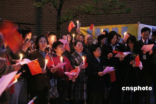 当地时间5月11日晚,美国纽约华人社团联席会及华人华侨各界为5.12汶川地震一周年举行烛光追悼会。许多当地华侨华人举着国旗,手捧蜡烛,缅怀逝者寄托哀思。