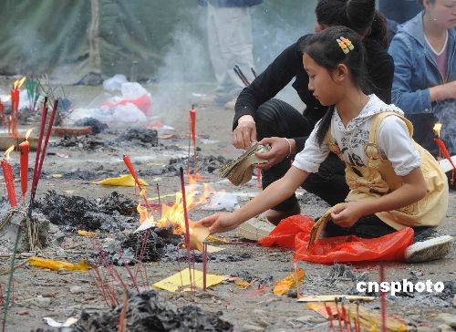 五月十二日是“四川特大地震”一周年祭日,一位小姑娘和妈妈来到遭摧毁的北川中学,面对遇难亲人和师生的废墟烧纸祭奠。中新社发 贾国荣 摄