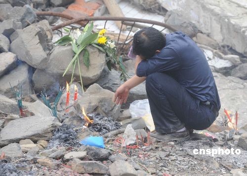 五月十二日是“四川特大地震”一周年祭日,一名男子回到遭摧毁的北川老县城,面对亲人遇难的废墟伤心痛哭。中新社发 贾国荣 摄