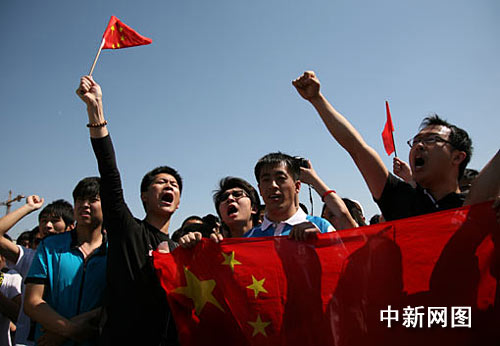 2009年5月12日,汶川大地震一周年。当日下午,大批群众自发聚集在北京天安门广场,为汶川地震的罹难同胞默哀。默哀过后人们高举五星红旗唱响国歌,天安门广场回荡起“中国加油”、“四川加油”的呐喊声。
