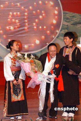 5月12日,由著名演员斯琴高娃主演的影片《爱的延续》在江苏南通举行首映式。斯琴高娃(中)与来自四川地震灾区的学生出席首映式。该片讲述一位教师关心地震灾区孤儿的故事。中新社发 张亨伟 摄